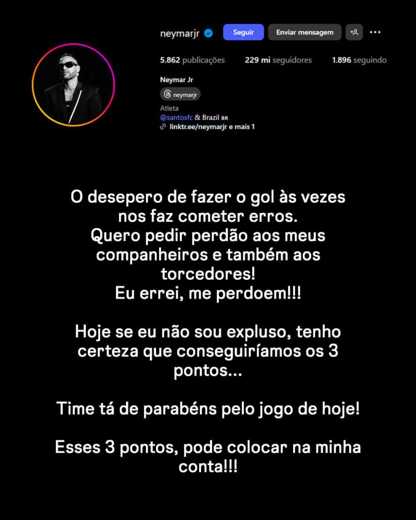 Neymar utilizou as redes sociais para se desculpar pela expulsão.